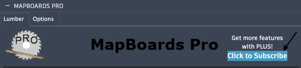 When the trial expires your entitlement will revert back to your perpetual license features of MapBoards Pro. A subscription is available if you wish to continue using the PLUS features. You can subscribe by clicking the subscribe link in the Lumber tab header. The subscription is $25 for one year. Clicking the subscribe link will open a dialog allowing you to make payment via PayPal. Once payment is made your PLUS features will be enabled for one year.