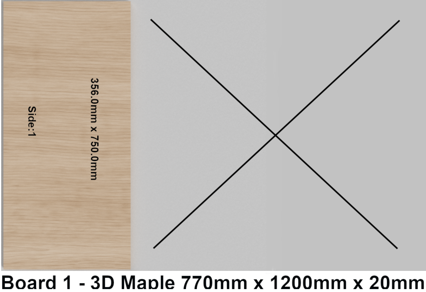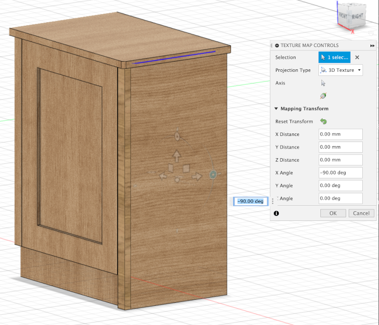 Wood grain is often aligned along the longest edge length matching the MBP mapping. MBP will align the longest edge with the targeted board’s grain direction by default. When a component has a 3D appearance applied the Texture Map Controls, available by right-clicking on a selected component, can be used to rotate the visible grain to make it more aesthetically pleasing. This rotation will only be recognized if it is aligned or perpendicular with the component’s long edge. Shown here are Texture Map Controls being used to rotate the grain to be perpendicular to its long edge on a cabinet side and the resulting map created for this side when this option is set. The side is vertically oriented but the grain is horizontal, matching the targeted board’s grain which in this case was set to horizontal on the created map.