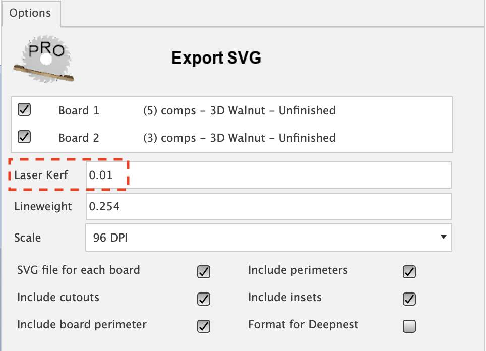 Showed here is an Export Map to SVG task with a Laser Kerf value of 0.01 mm.