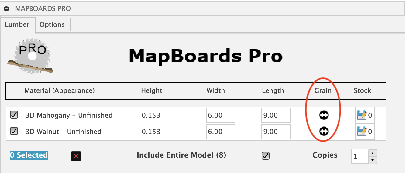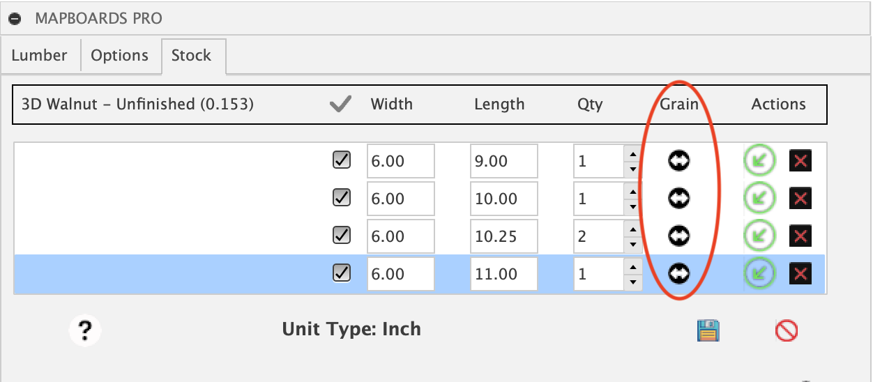 The component’s grain will be aligned with the grain on the targeted board. Grain direction on the targeted board is selectable using the double-arrowed icons, horizontal (X)