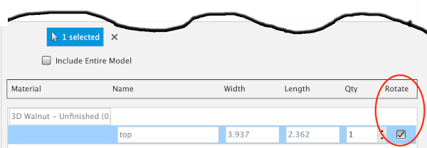 By default, the component’s grain is determined by its longest edge. This can be overridden by applying a 3D appearance and enabling Automatic Grain Alignment. The Component grain determined by either method can be rotated perpendicular to the board’s grain direction by choosing Rotate when a component has been selected, as shown below. See Selection Support for details.