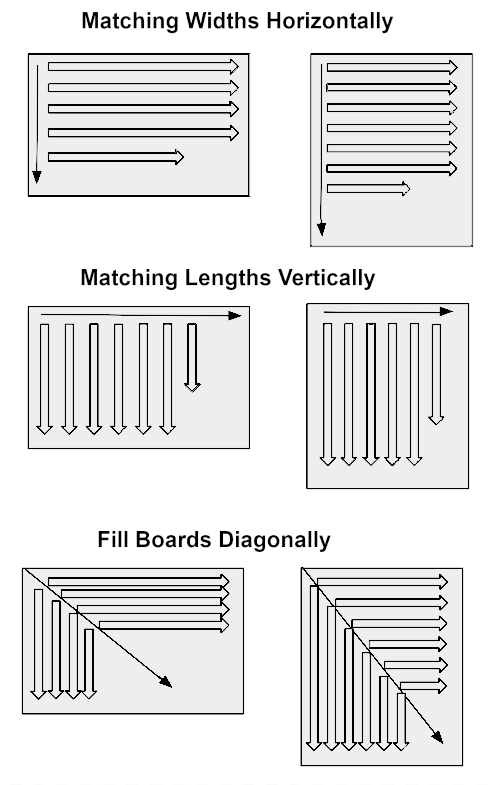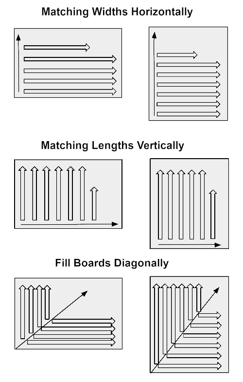 Components are sorted by width and length in descending order. Components of the same width will then fill the board horizontally. This can be used for rip cutting when a board`s longest dimension is horizontal and cross cutting when the longest dimension is vertical.